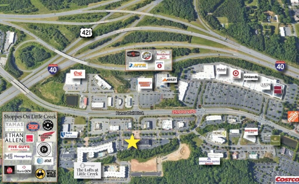 Walkable lifestyle development located on Hanes Mall Blvd. with easy access to Stratford Rd, Hwy 421 & I-40